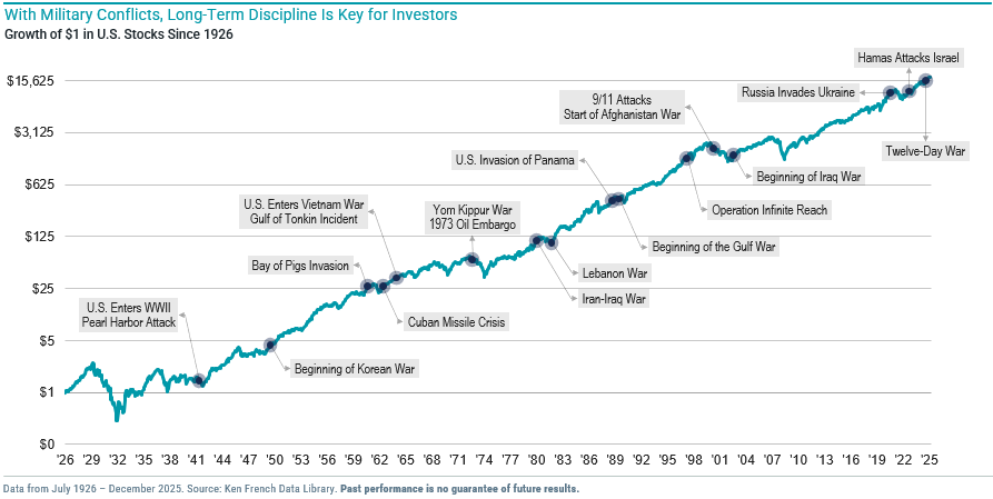 When we look at similar historical events as a guide, there is a clear lesson that staying invested at your target risk level and not attempting to time the market is the best course of action for long-term investment success. We understand that this can be difficult when the headlines sound dire and volatility in the market has spiked, but we remain optimistic given the aligned incentives of the world’s major powers to find a resolution. We will continue to monitor the latest Iran conflict developments and will make the adjustments we deem appropriate to client portfolios.